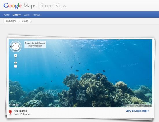 凱特琳海景調(diào)查組織的幾名成員使用特殊的攝影機(jī)潛入海底拍攝了全景照片,然后將其整合到谷歌地圖中,以類似于“街景”服務(wù)的模式為用戶提供服務(wù),使之不必親自潛水也可以欣賞海底美景。