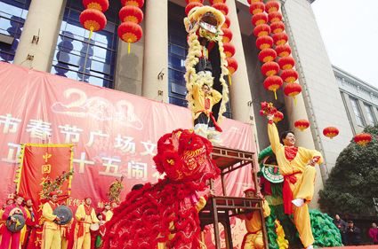 作為2013年蚌埠市春節(jié)廣場(chǎng)文化活動(dòng)的壓軸大戲,整場(chǎng)演出共有來自禹會(huì)區(qū)文化館、蚌山區(qū)文化館和龍子湖區(qū)文化館的8支花鼓燈表演隊(duì)先后登臺(tái)獻(xiàn)藝,一個(gè)小時(shí)的演出吸引了上千名市民駐足觀看。據(jù)市文廣新局負(fù)責(zé)人介紹,這8支花鼓燈隊(duì)伍從全市一百多支花鼓燈藝術(shù)團(tuán)中脫穎而出,聚集在科學(xué)宮廣場(chǎng)上表演,為市民送上元宵節(jié)藝術(shù)大餐。